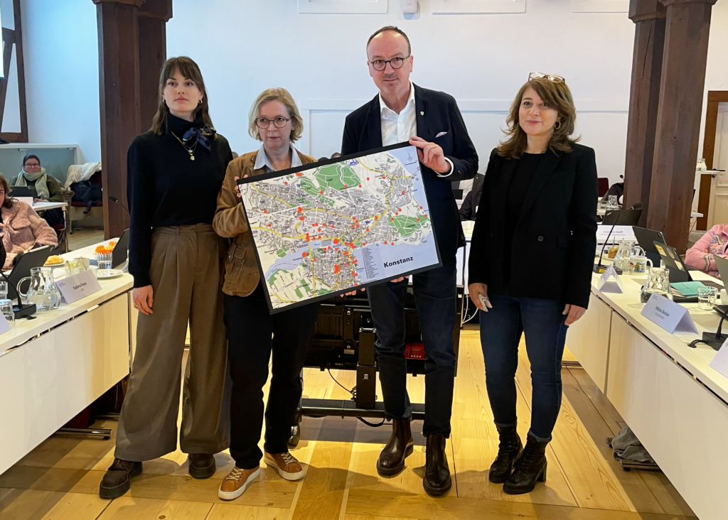 Die dritte Bürgerin, Rebecca Reichmann, ordnete das Anliegen über Konstanz hinaus ein: Frauennachttaxis gebe es bereits in vielen Städten. Solange das grundlegende Sicherheitsproblem nicht gelöst sein, brauche es pragmatische Maßnahmen. Sie sprach auch die Finanzierung an: Fünf Euro als Gutschein seien zu wenig. Reichmann regte an, den Betrag zu erhöhen, sobald die Finanzen es zulassen. Zum Abschluss übergaben die Sprecherinnen dem Oberbürgermeister die „Karte der Angst-Orte“.